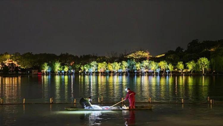 4月8日晚,职责主说念主员在西湖计帐荷塘。(受访者供图)