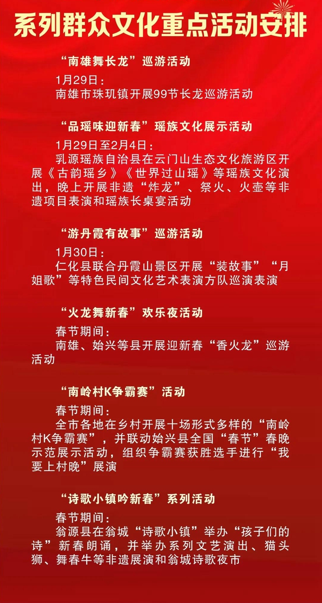 10个县(市、区)折柳重心打造一场春节文旅行动,配套N个系列行动,在春节时辰尽心谋划开展春节习惯、非遗巡游、迎春花市、道贺灯会、狂欢派平等主题丰富、精彩纷呈的春节文旅体行动总共200余项,为市民搭客献上一场场春节文旅盛宴。