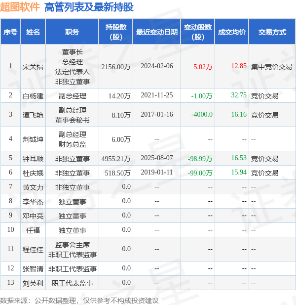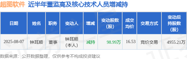 证券之星音问,字据8月8日阛阓公开信息、上市公司公告及交游所浮现数据整理,超图软件(300036)最新董监高及干系东谈主员股份变动情况:2025年8月7日公司董事钟耳顺共减捏公司股份98.99万股,占公司总股本为0.2009%。变动时辰公司股价下落0.84%,8月7日当日收盘报16.51元。