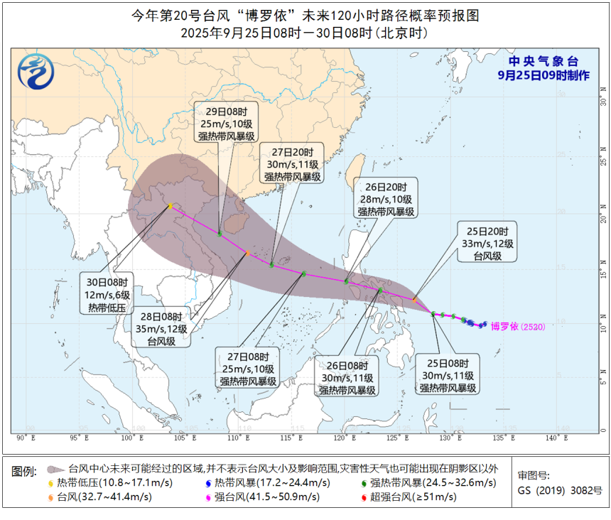 本年第20号台风“博罗依”已于昨天(9月24日)夜间加强为强热带风暴级,其中心今天(9月25日)清早5点钟位于菲律宾马尼拉东偏南边向约990公里的西北太平洋洋面上,即是北纬10.8度、东经129.2度,11级(30米/秒),980百帕,七级风圈半径为220-300公里,十级风圈半径为60-80公里。