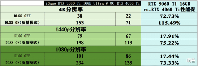 iGame GeForce RTX 5060 Ti Ultra W OC 16GB 的测试情况肖似。可以看到即使在4K差异率下,开启DLSS 4 4x质地格式之后,游戏帧率也能寂静在150fps以上,游戏历程相配绽开。而与RTX 4060 Ti比较较。可以看到在4K差异率下开启DLSS 4 4x之后,iGame GeForce RTX 5060 Ti 16GB Ultra W OC 16GB显卡的性能比较RTX 4060 Ti的进步幅度达到了70%以上。
