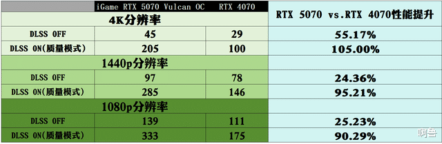 先看RTX 5070的情况。4K差异率(光追、画质拉满+DLSS 4质地格式)下iGame GeForce RTX 5070 Vulcan OC 12GB淌若不开启DLSS,游戏帧率约为45fps,合座嗅觉比较卡顿。不外开启DLSS 4 4x之后,游戏帧率则飙升到了205fps,游戏变得相配绽开,开启DLSS 4 4x质地格式之后,游戏帧率的升迁幅度达到了4倍以上。相似的情况在1440p差异率和1080p差异率下也基本重迭。从合座收货来看,iGame GeForce RTX 5070 Vulcan OC 12GB显卡比较RTX 4070的性能进步约25%(4K差异率下更高),开启DLSS 4 4x之后,比较只可开启DLSS 3的RTX 4070,性能简直已毕了翻倍的升迁。