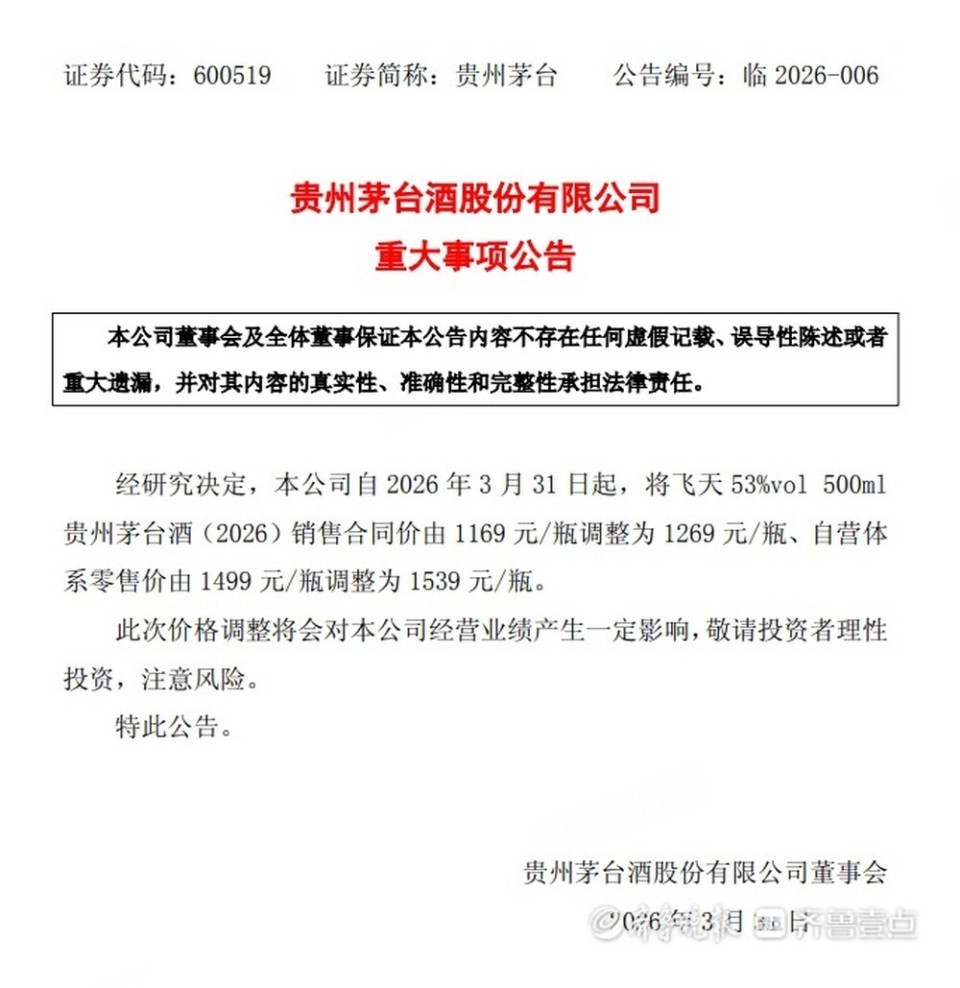 3月30日晚,贵州茅台发布公告称,自2026年3月31日起欧洲杯体育,飞天53%vol500ml贵州茅台酒(2026)销售公约价由1169元/瓶休养为1269元/瓶,自营体系零卖价由1499元/瓶休养为1539元/瓶。这也意味着,抓续8年的1499元/瓶的飞天茅台官方指导价厚爱终结。济南商场有何变化?对此,记者进行了打听。