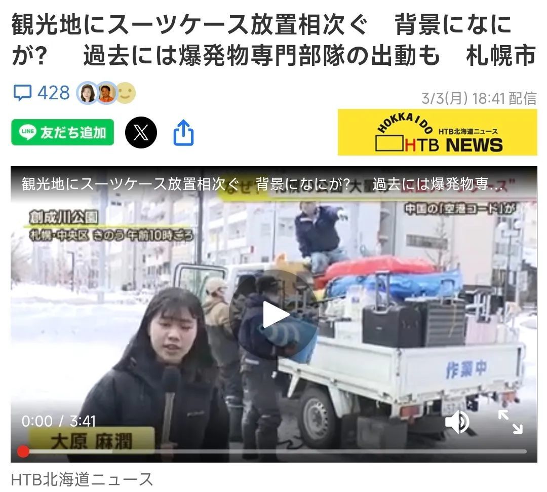 凭据日媒报导,别称北海说念全球近日在社群平台X(原Twitter) 发文抱怨,暗意在札幌市的公园内发现十多个肃清行李箱,以致还有塑胶盒、纸箱、塑料瓶等垃圾。从行李箱上贴着的机场代码贴纸来看,这些应该是来自深圳和中国香港的游客留住的,「连最基本的章程都不守的番邦东说念主,真实不但愿他们改日本。」